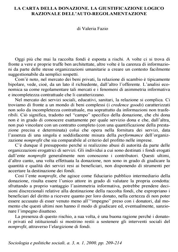 Valeria Fazio, La carta della donazione. Giustificazione logico-razionale dell'auto-regolamentazione in "SOCIOLOGIA E POLITICHE SOCIALI" 2/2000, pp , DOI: