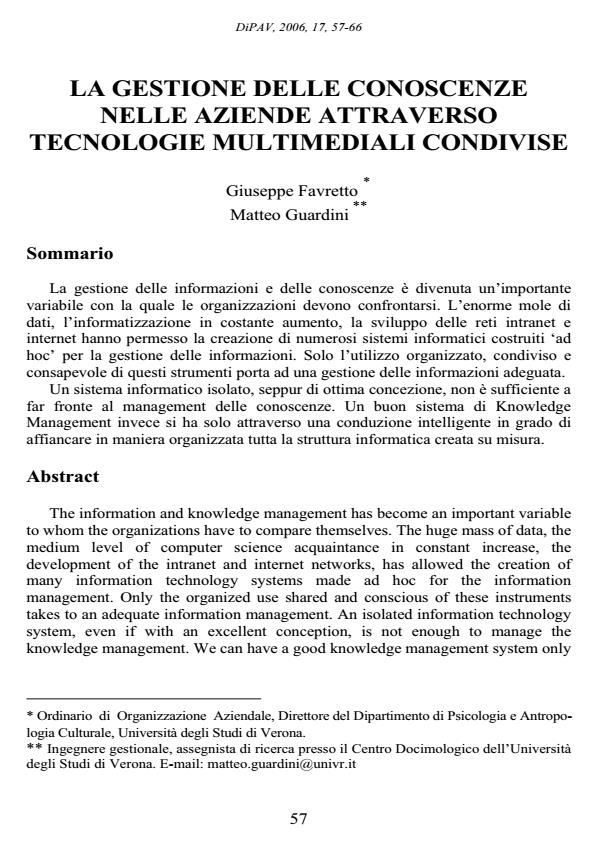 Giuseppe Favretto, Matteo Guardini, La gestione delle conoscenze nelle aziende attraverso tecnologie multimediali condivise in "DiPAV - QUADERNI" 17/2006, pp 57-66, DOI: