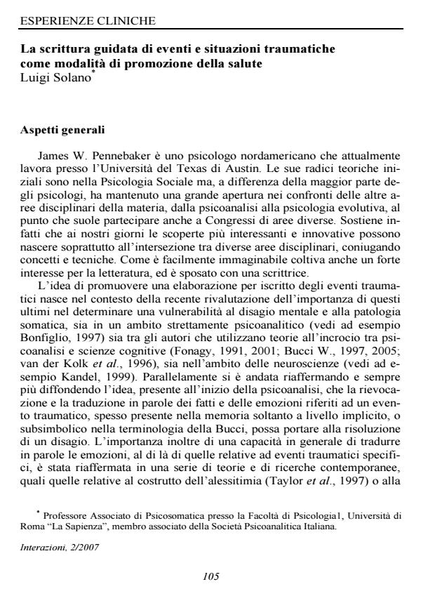 Luigi Solano, La scrittura guidata di eventi e situazioni traumatiche come modalità di promozione della salute in "INTERAZIONI" 2/2007, pp 105-134, DOI: