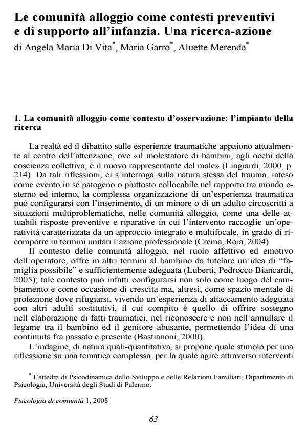 Angela Maria Di Vita, Maria Garro, Aluette Merenda, Le comunità alloggio come contesti preventivi e di supporto all’infanzia. Una ricerca-azione in "PSICOLOGIA DI COMUNITA’" 1/2008, pp 63-74, DOI: