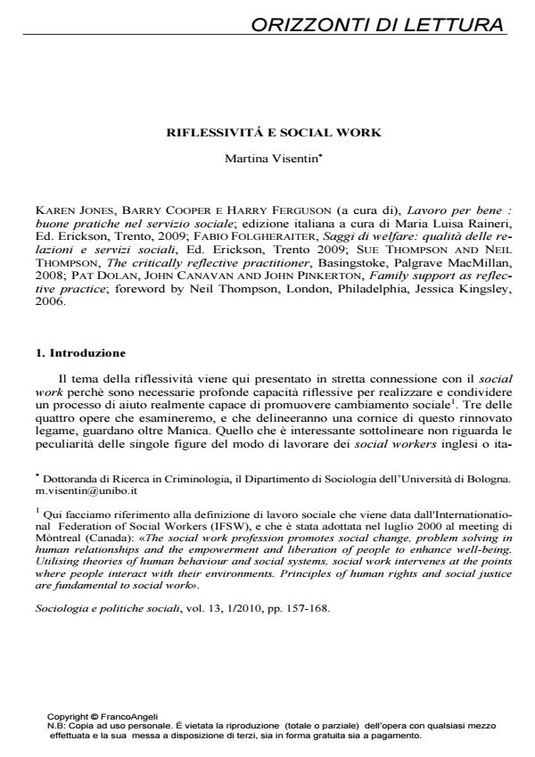 Martina Visentin, Riflessività e social work in "SOCIOLOGIA E POLITICHE SOCIALI" 1/2010, pp 157-168, DOI: 10.3280/SP2010-001007