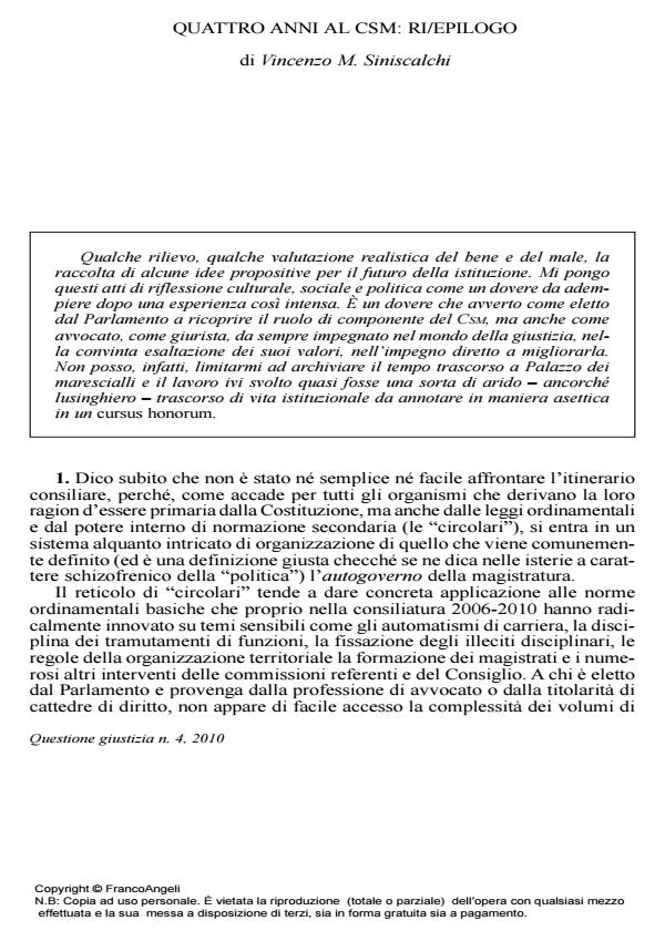 Vincenzo Siniscalchi, Quattro anni al Csm: ri/epilogo in "QUESTIONE GIUSTIZIA " 4/2010, pp 25-35, DOI: 10.3280/QG2010-004003