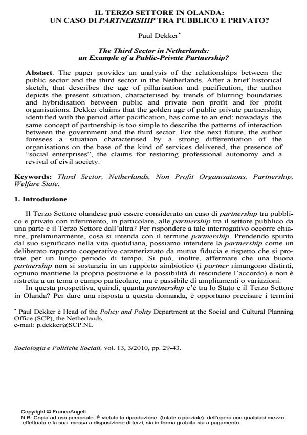 Paul Dekker, Il terzo settore in Olanda: un caso di partnership tra pubblico e privato? in "SOCIOLOGIA E POLITICHE SOCIALI" 3/2010, pp 29-43, DOI: 10.3280/SP2010-003003