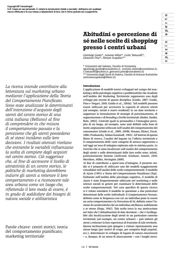 Gianluigi Guido, Antonio Mileti, Carla Tomacelli, Giovanni Pino, Miriam Scapolan, Abitudini e percezione di sé nelle scelte di shopping presso i centri urbani in "TERRITORIO" 64/2013, pp 121-130, DOI: 10.3280/TR2013-064021