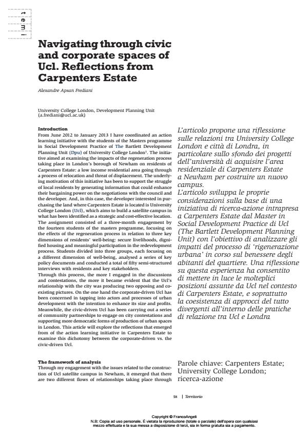 Alexandre Apsan Frediani, Navigating through civic and corporate spaces of Ucl. Reflections from Carpenters Estate in "TERRITORIO" 66/2013, pp 58-63, DOI: 10.3280/TR2013-066013
