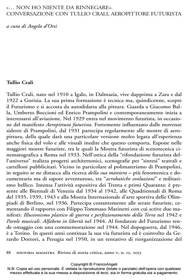 Angelo d'Orsi, Bianca Pedace, "..Non ho niente da rinnegare". Conversazione con Tullio Crali, aeropittore futurista in "HISTORIA MAGISTRA" 12/2013, pp 88-100, DOI: 10.3280/HM2013-012008