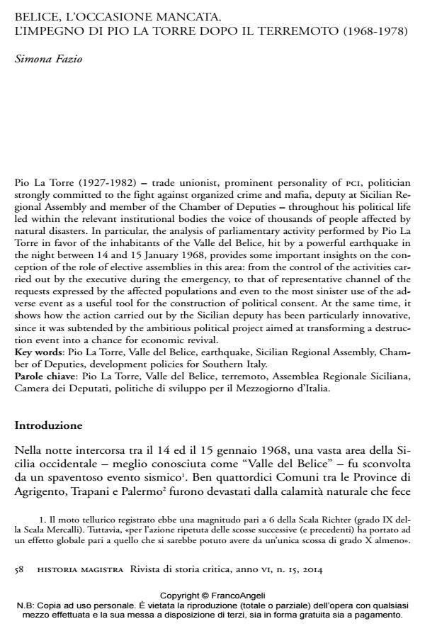 Simona Fazio, Belice, l’occasione mancata. L’impegno di Pio La Torre dopo il terremoto (1968-1978) in "HISTORIA MAGISTRA" 15/2014, pp 58-72, DOI: 10.3280/HM2014-015006