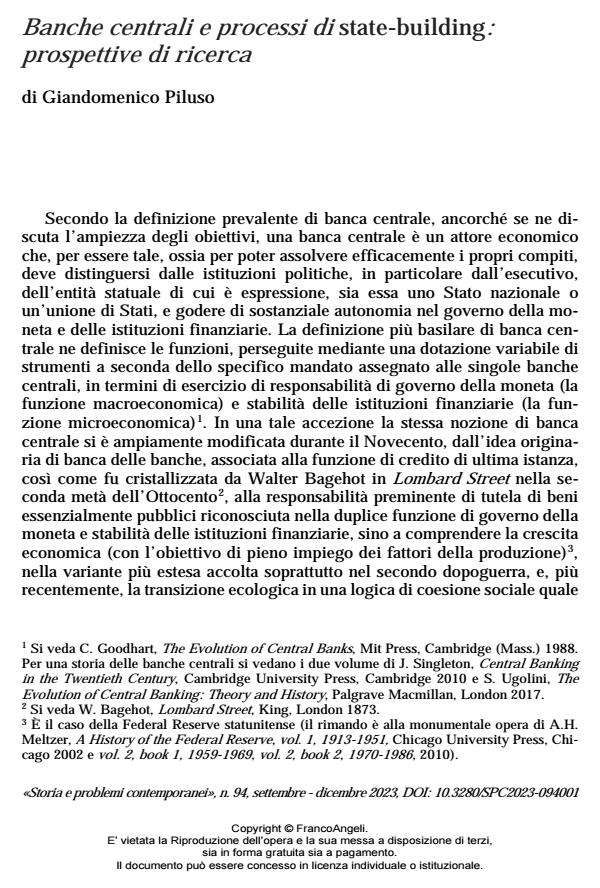 Giandomenico Piluso, Banche centrali e processi di state-building: prospettive di ricerca in "STORIA E PROBLEMI CONTEMPORANEI" 94/2023, pp 5-15, DOI: 10.3280/SPC2023-094001